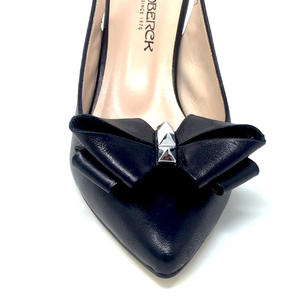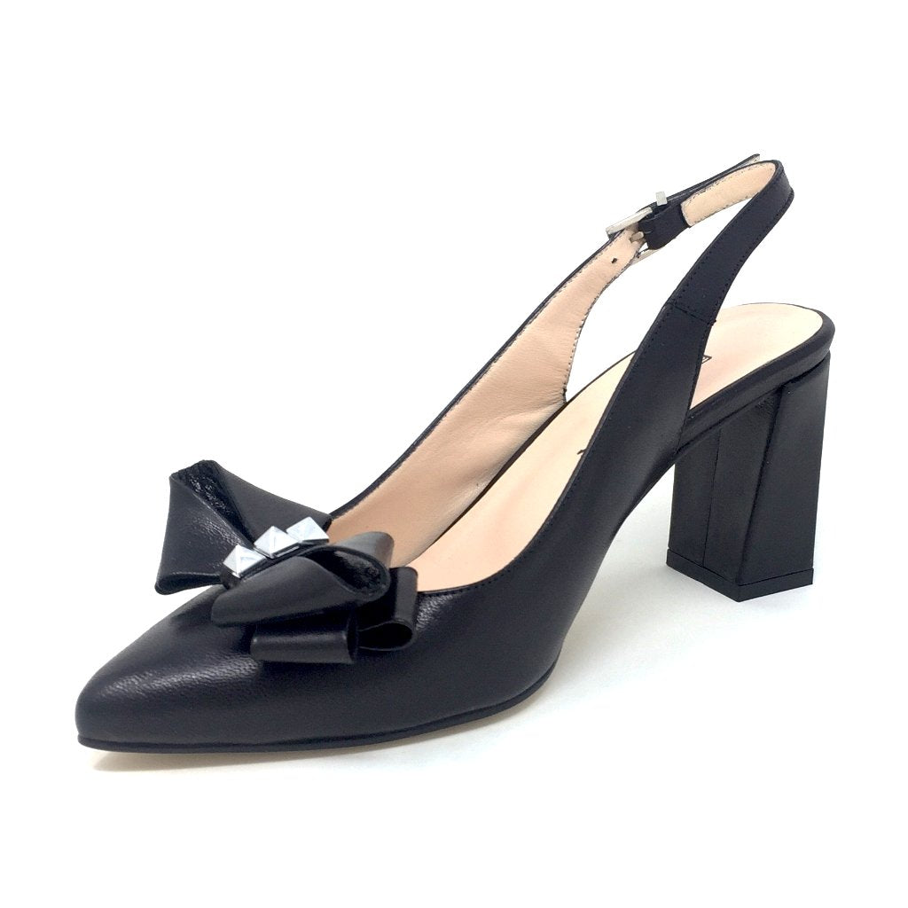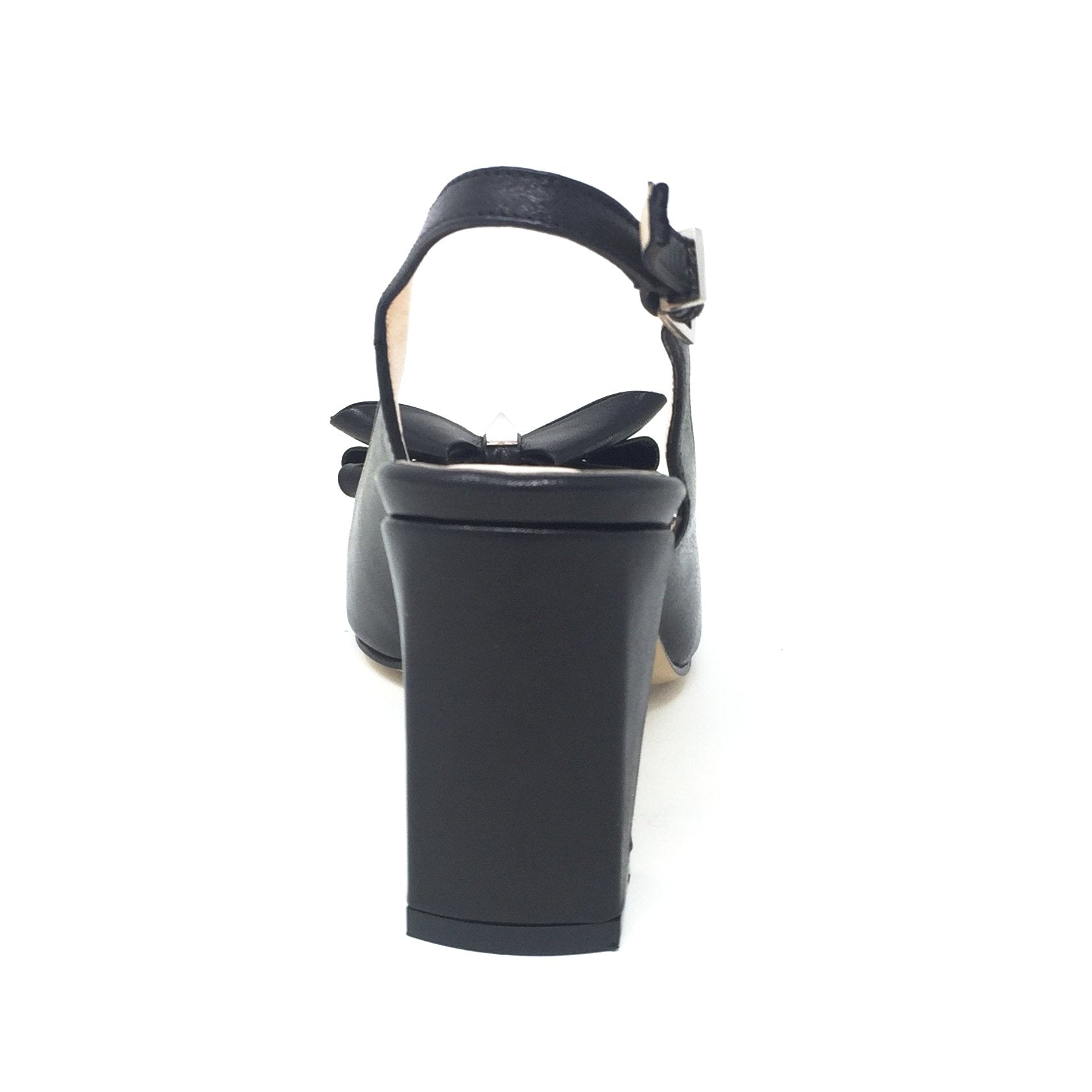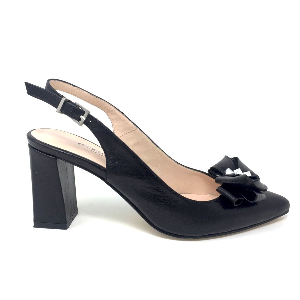 Zapatos de taco cuadrado, con cinta de cuero y pedrería.