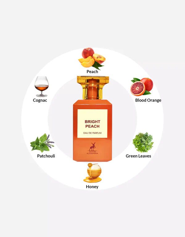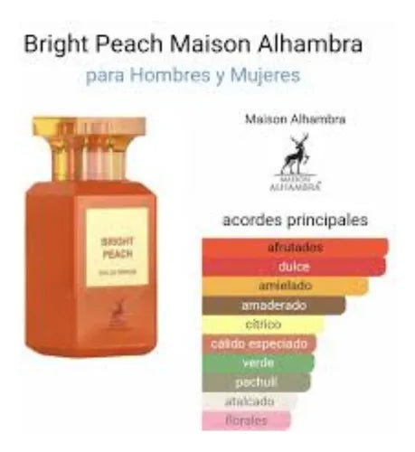 Bright Peach de Maison Alhambra es una fragancia de la familia olfativa para Hombres y Mujeres. Las Notas de Salida son durazno (melocotón), naranja sanguina y hojas verdes; la Nota de Corazón es pachulí; las Notas de Fondo son miel y coñac.