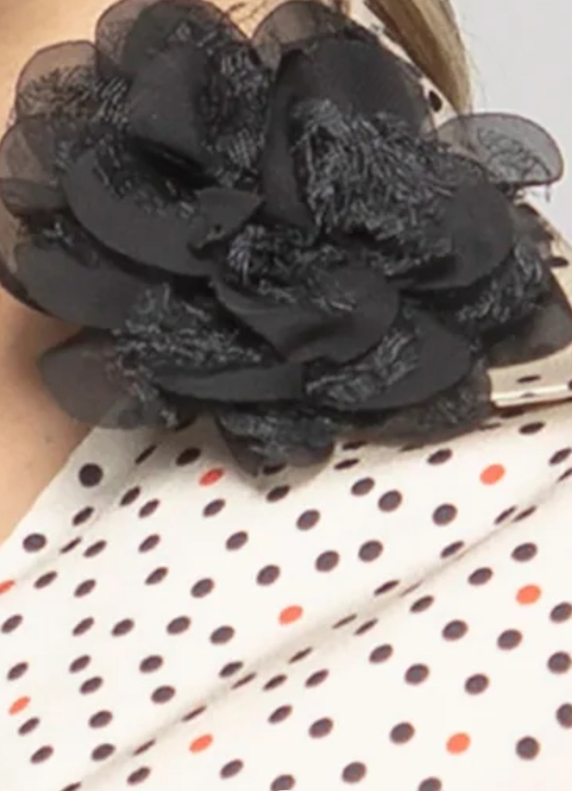 Un guiño retro reinterpretado desde la simpleza moderna. Esta blusa de escote en V profundo combina la estructura de una camisa con la fluidez de una prenda liviana. El estampado de lunares negros y rojos sobre fondo neutro claro aporta frescura y personalidad, mientras que el corte holgado permite movimiento y comodidad durante todo el día. Ideal para llevar por dentro en pantalones sastre o para dar un aire relajado sobre jeans o faldas. Atrévete con su accesorio de flor decorativa al cuello para reforzar su carácter lúdico. Una pieza versátil que marca presencia sin esfuerzo.