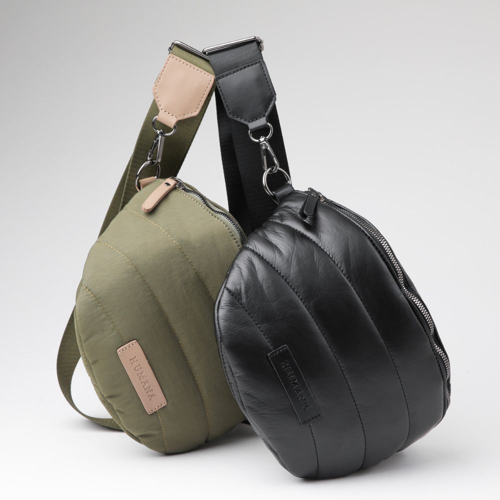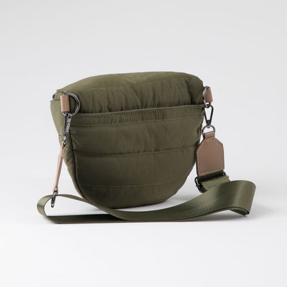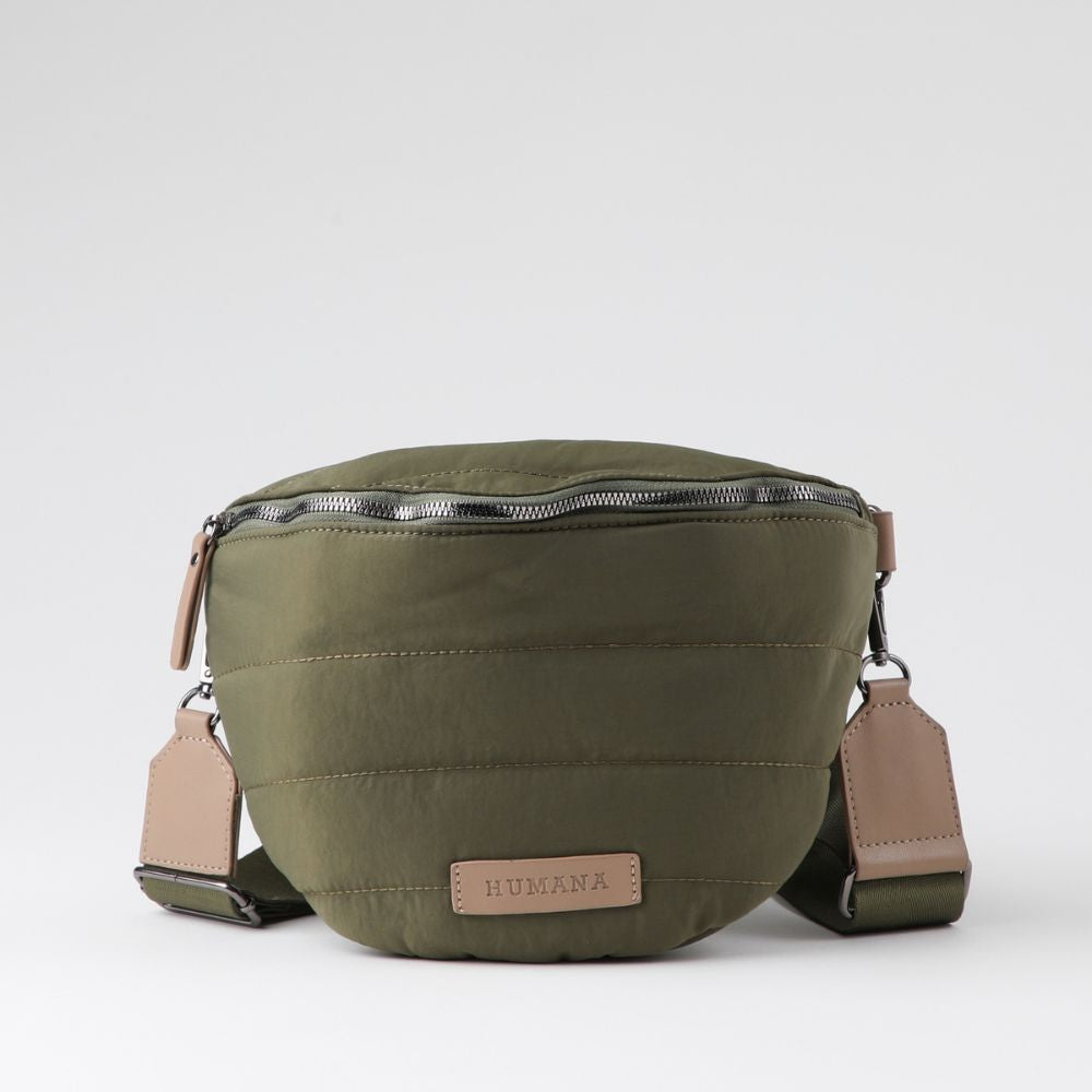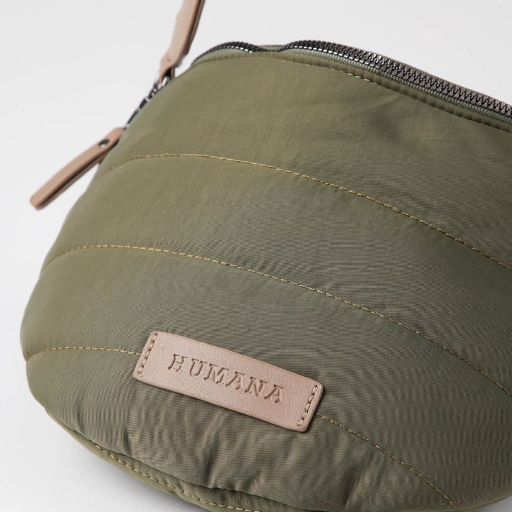 Banano de nylon verde con cierre y correa de tela negra ajustable. En su interior tiene un bolsillo con cierre y otro abierto. Al exterior en la parte trasera tiene un bolsillo con imán. Las argollas son de metal plateado oscuro y los tiradores de ecocuero beige.