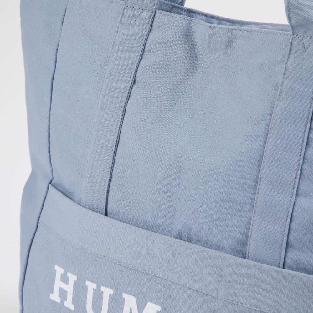 Cartera de playa de canvas azul con cierre y dos asas para llevarla como cartera de hombro. En su interior tiene dos bolsillos abiertos y en el exterior tiene un bolsillo con imán.