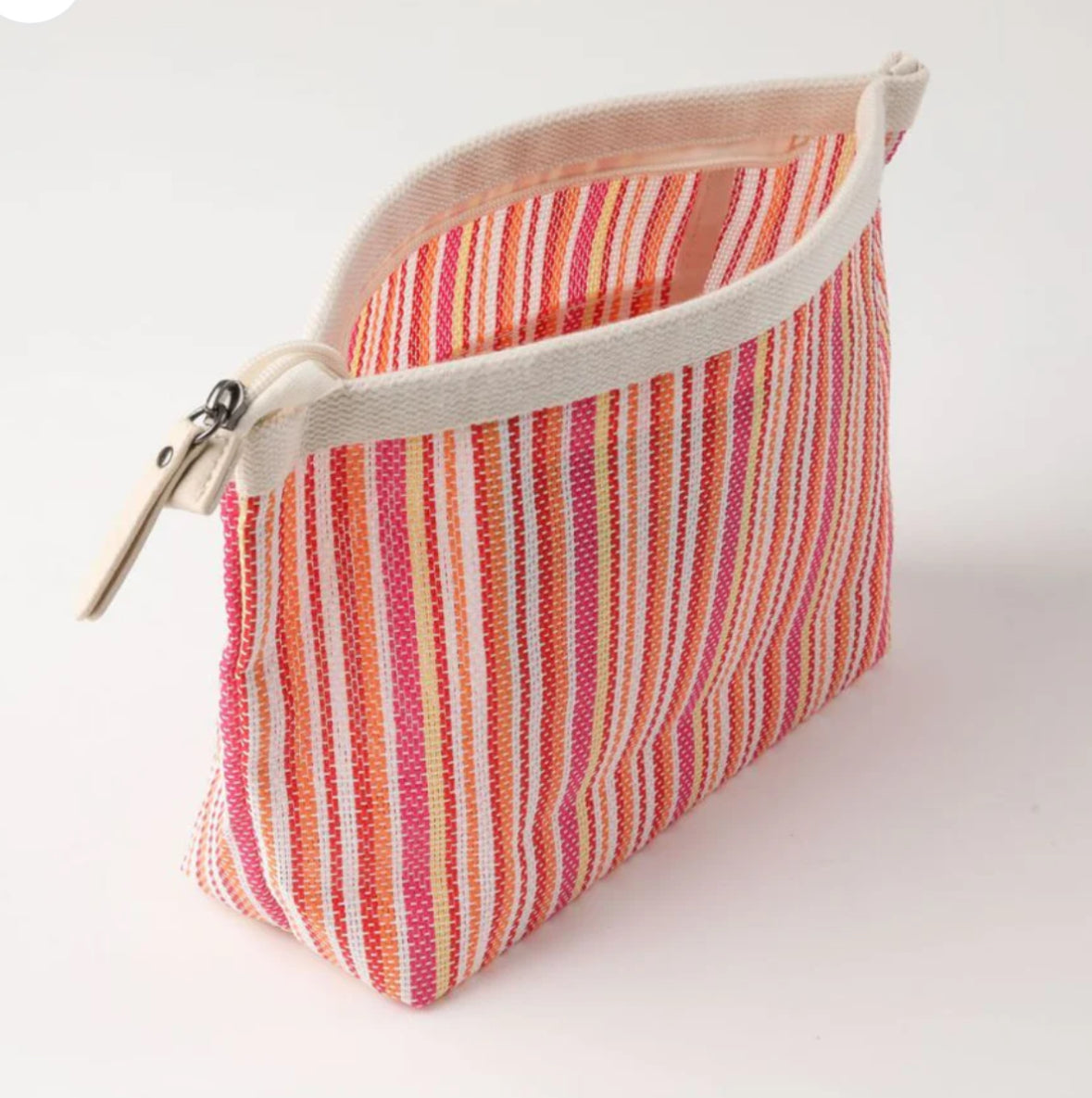 Cosmetiquero micro tejido en tonos naranjo, fucsia, amarillo, rojo y blanco. Al interior tiene un bolsillo con cierre.