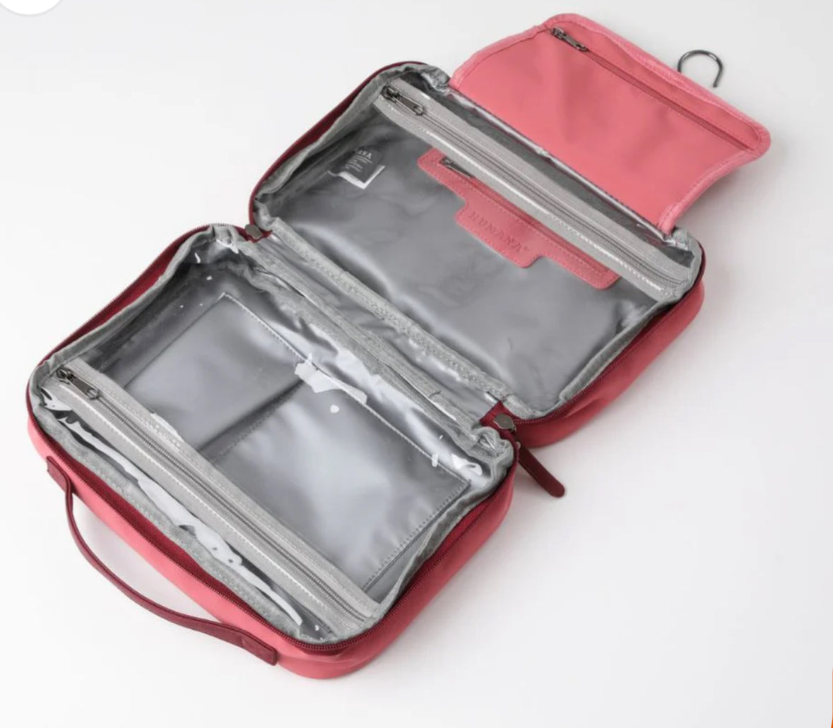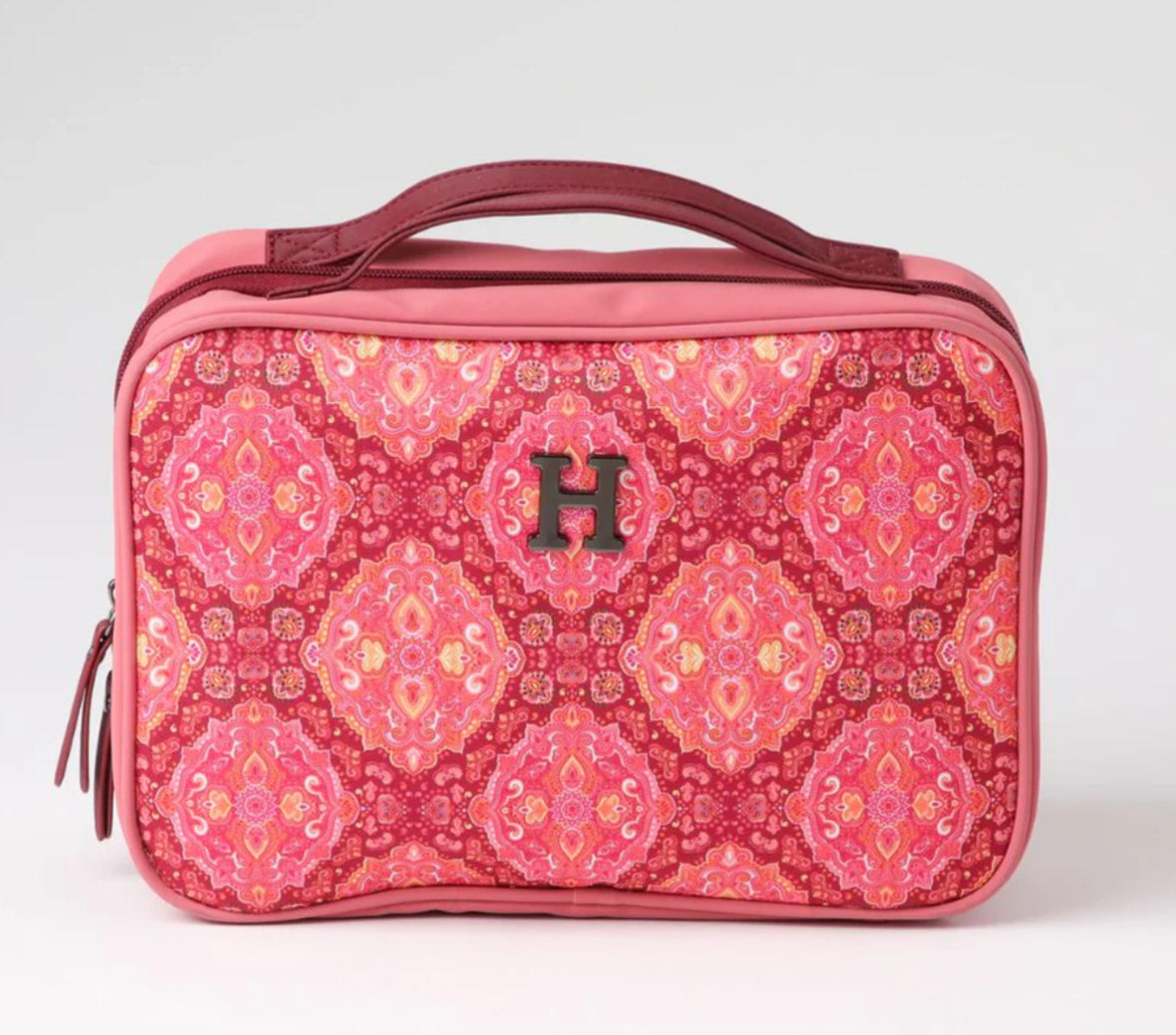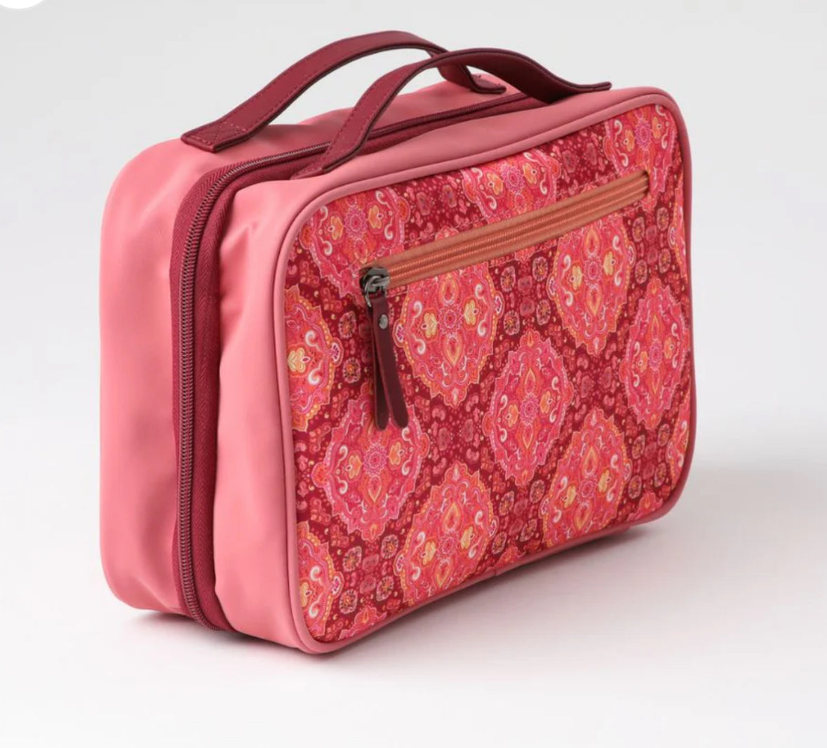 Cosmetiquero colgable con gancho, estampado con diseño estampado de mandales en tonalidades rosadas y moradas. Cuenta con 2 compartimiento grandes con forro impermiable, y 3 espacios pequeños con cierre.