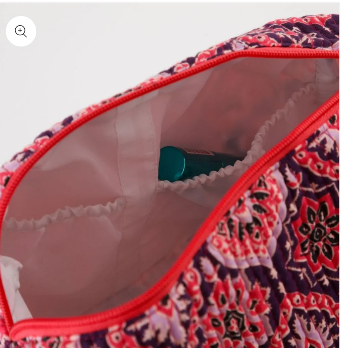 Cosmetiquero grande de tela estampada tipo paisley floral en tonos rosado, lila y negro sobre morado, con costuras en vertical tipo acolchado. Lleva cierre y su interior de nylon tiene 4 bolsillos abiertos elasticados. El tirador y logo son de ecocuero beige.