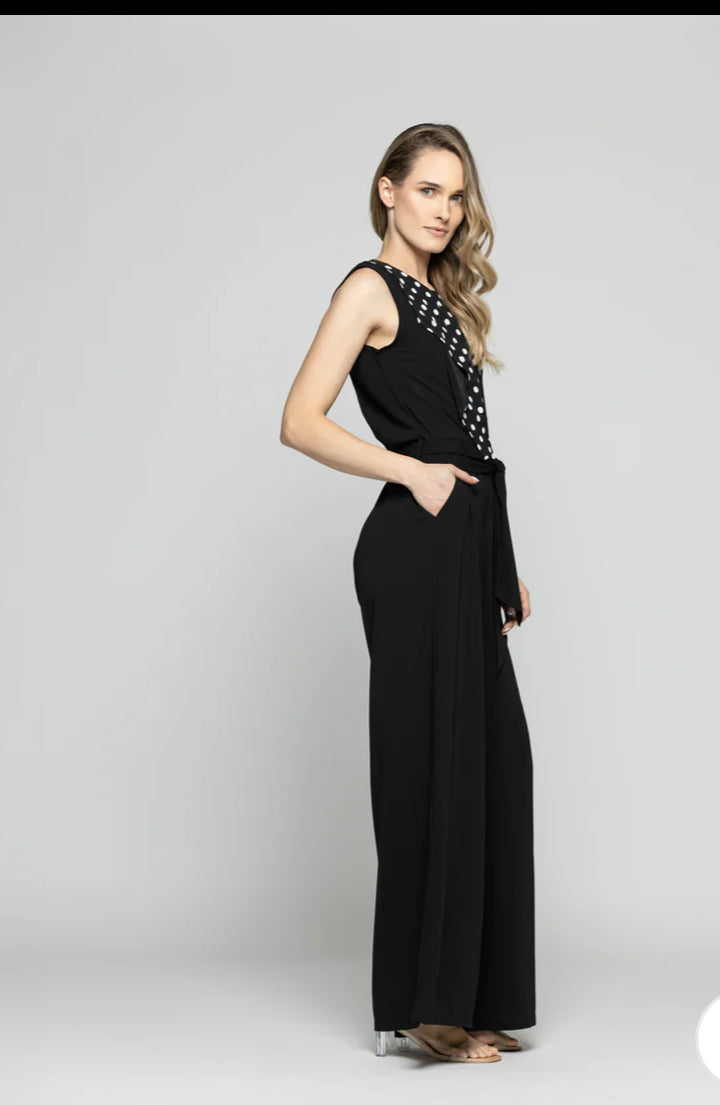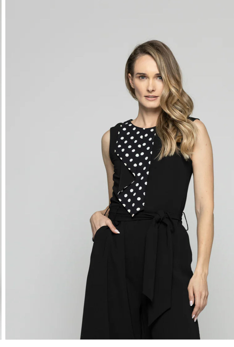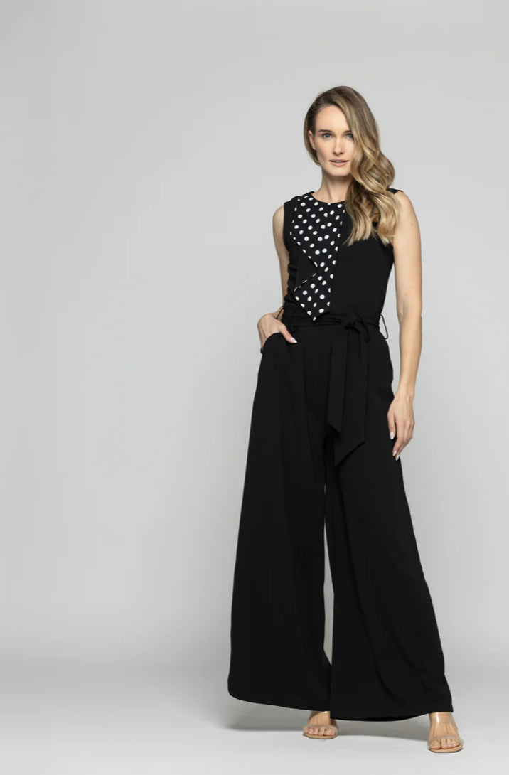 Un diseño con carácter y toques lúdicos que no pierde elegancia. El enterito Acanto Ludovica sin mangas destaca por su detalle asimétrico en lunares, realzado por un sutil volado que atraviesa el torso con movimiento. La base en negro aporta sobriedad, mientras que el print suma un guiño fresco y moderno. La silueta de piernas palazzo cae con fluidez desde la cintura, que se ajusta con un lazo del mismo tono para enmarcar la figura con suavidad. Ideal para llevar con sandalias neutras o sumar color en los accesorios. Una prenda que celebra el contraste y convierte lo simple en algo especial.