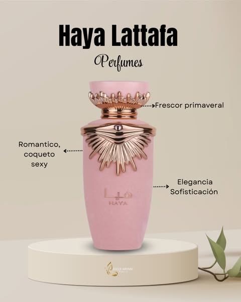 Haya de Lattafa Perfumes es una fragancia de la familia olfativa para Mujeres. Esta fragrancia es nueva. Haya se lanzó en 2022. Las Notas de Salida son champaña, fresa, naranja tangerina, naranja sanguina y rosa; las Notas de Corazón son gardenia, jazmín y orquídea de vainilla; las Notas de Fondo son ámbar, sándalo y castaña.
