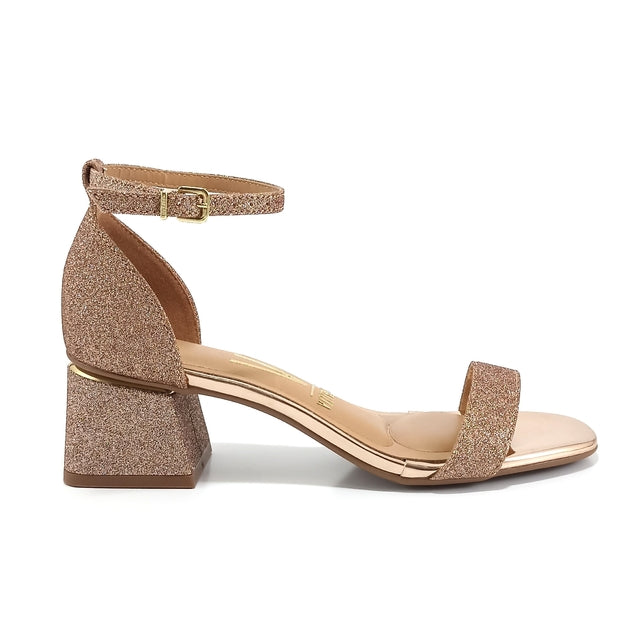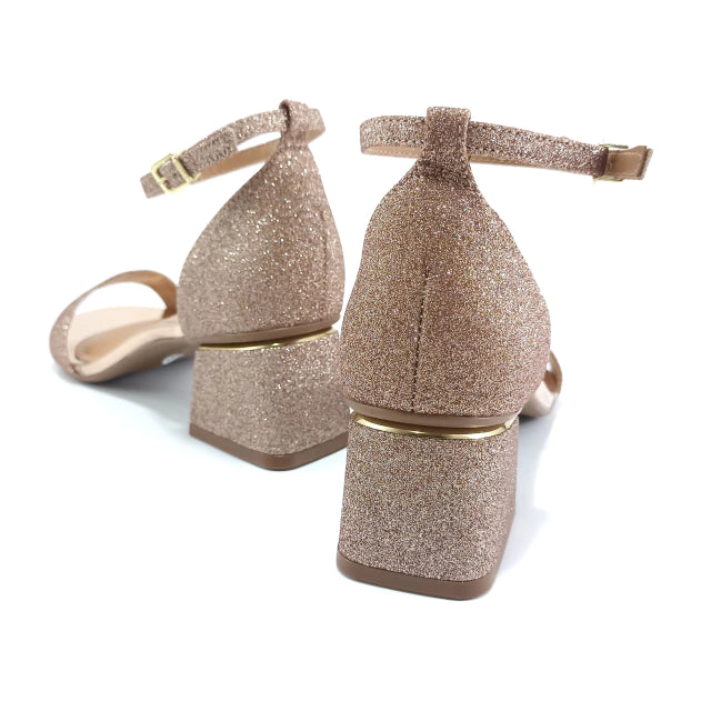 Sandalia Taco Ancho Textil Glitter Rose Gold