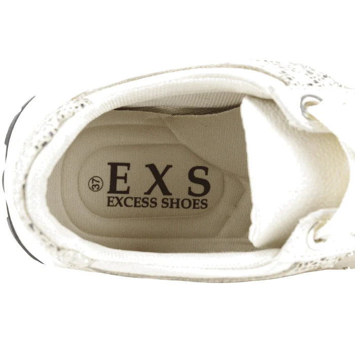 Zapatillas de Mujer Exs de cuero color beige, de fabricación colombiana. Estilo Urbano y Confort. Realza tu look diario con estas zapatillas. Su diseño combina diferentes tonos de beige y blanco, destacando los paneles con textura de piel de serpiente y las perforaciones decorativas con pequeñas tachuelas brillantes. La suela de plataforma blanca ofrece un confort duradero y un estilo actual. Ideales para quienes buscan un calzado con detalles únicos y sofisticados. Ajuste mediante cordones a tono. Plataforma de 5 cm de alto y caña de 6 cm de altura.