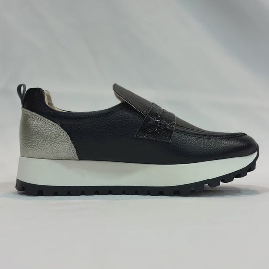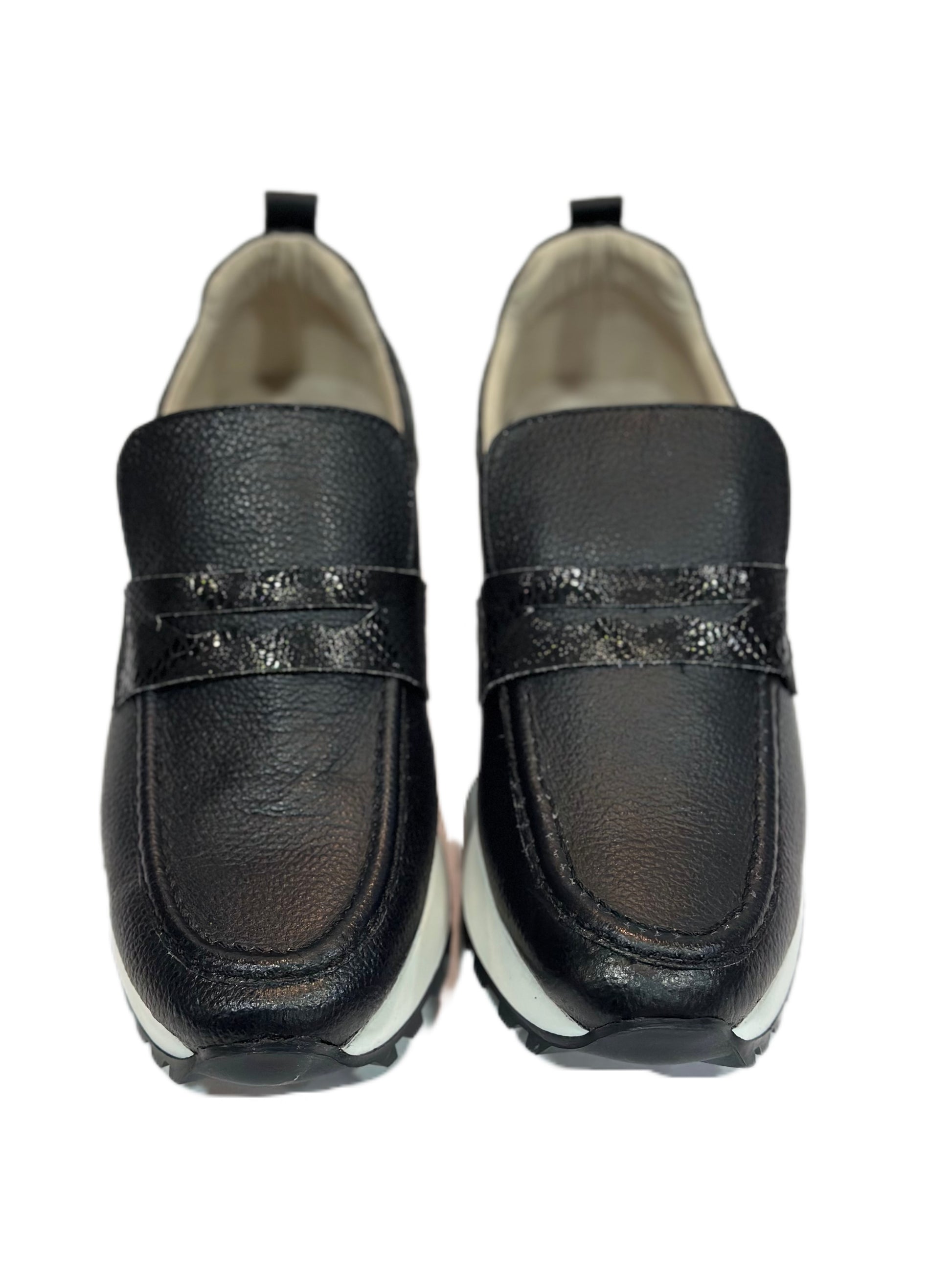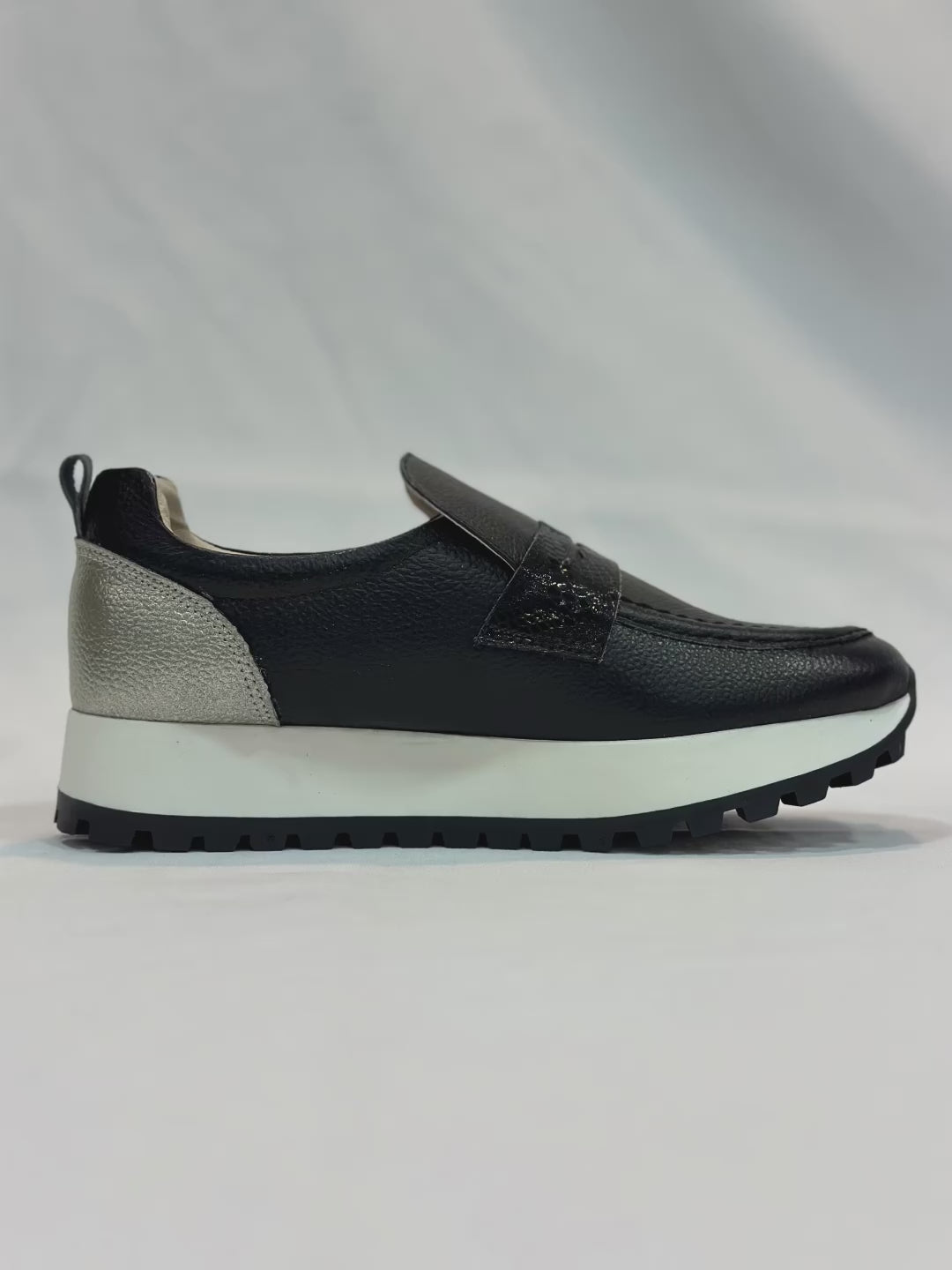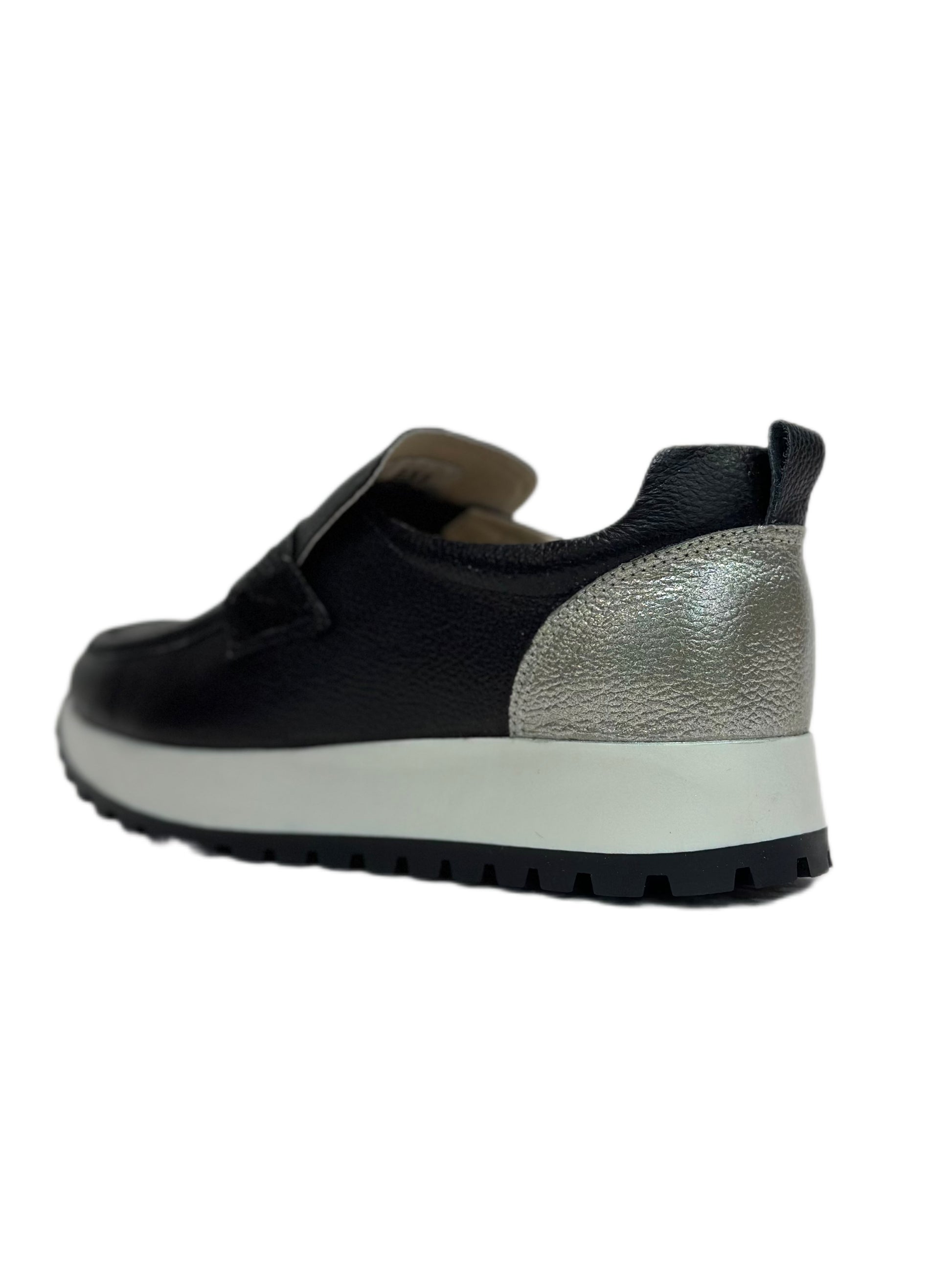 Zapatilla en cuero atenea tipo beatle con elástico en ambos costados combinación con cueros metalizados y cordones simplemente un esencial para esta temporada.