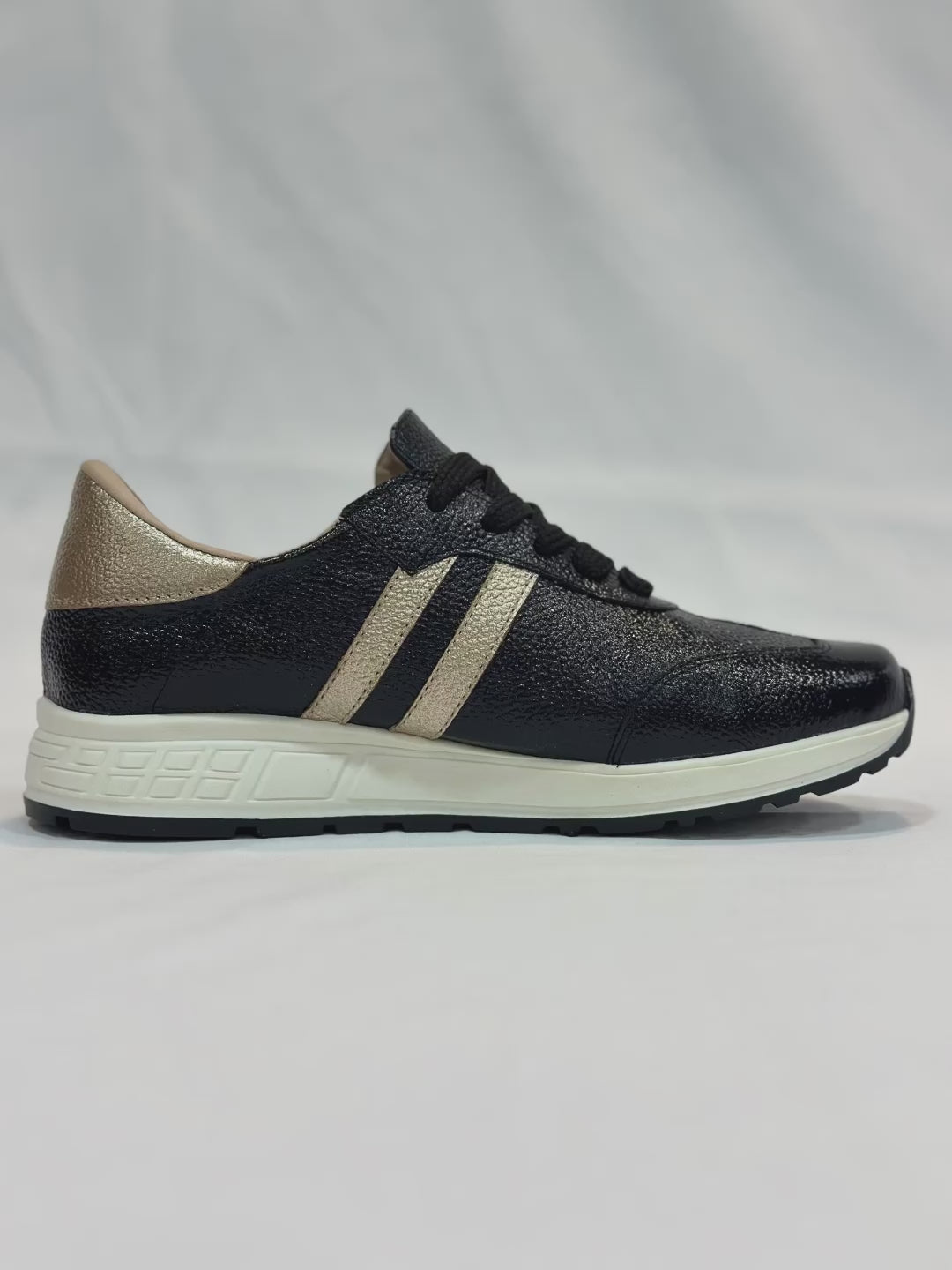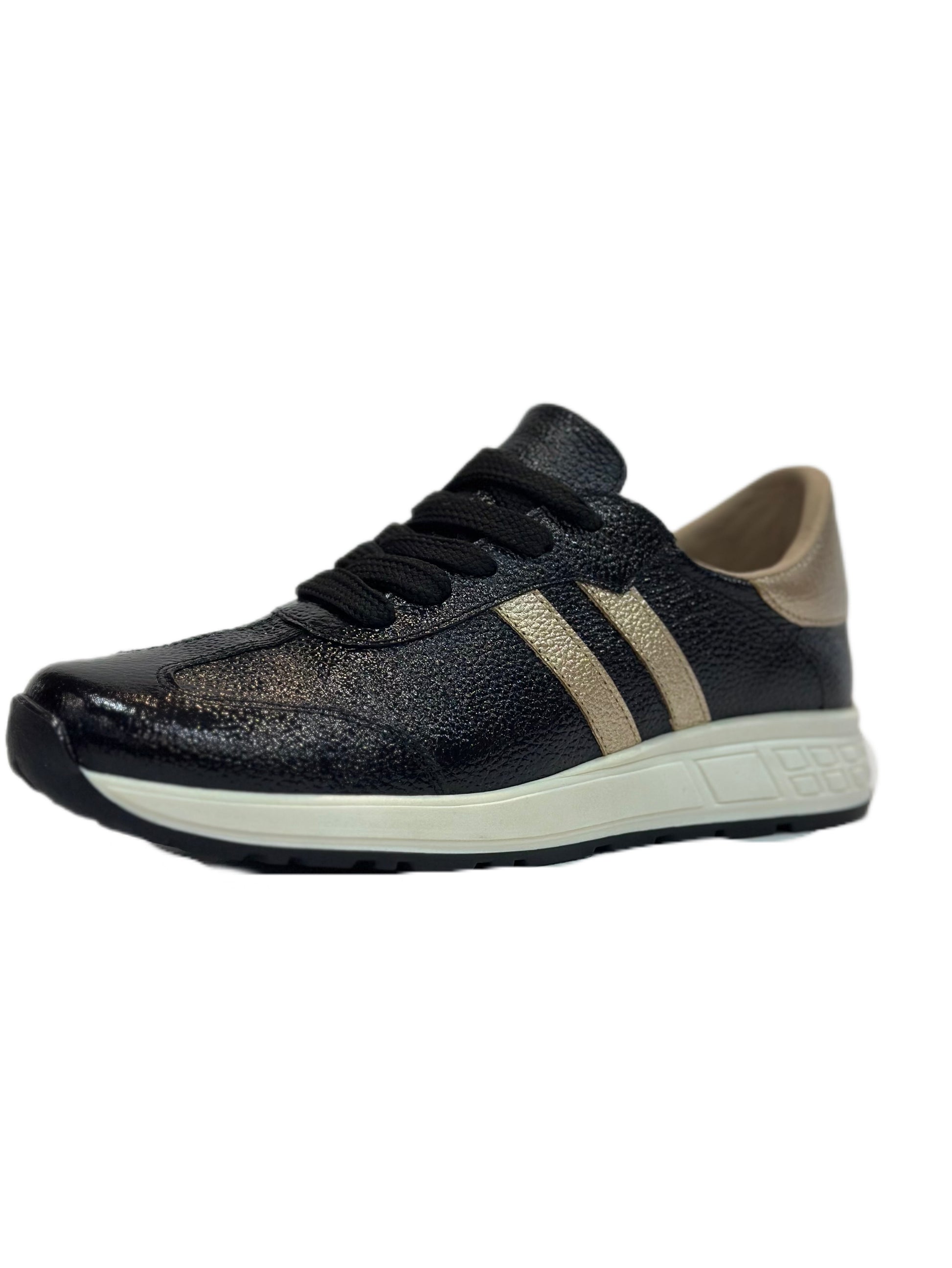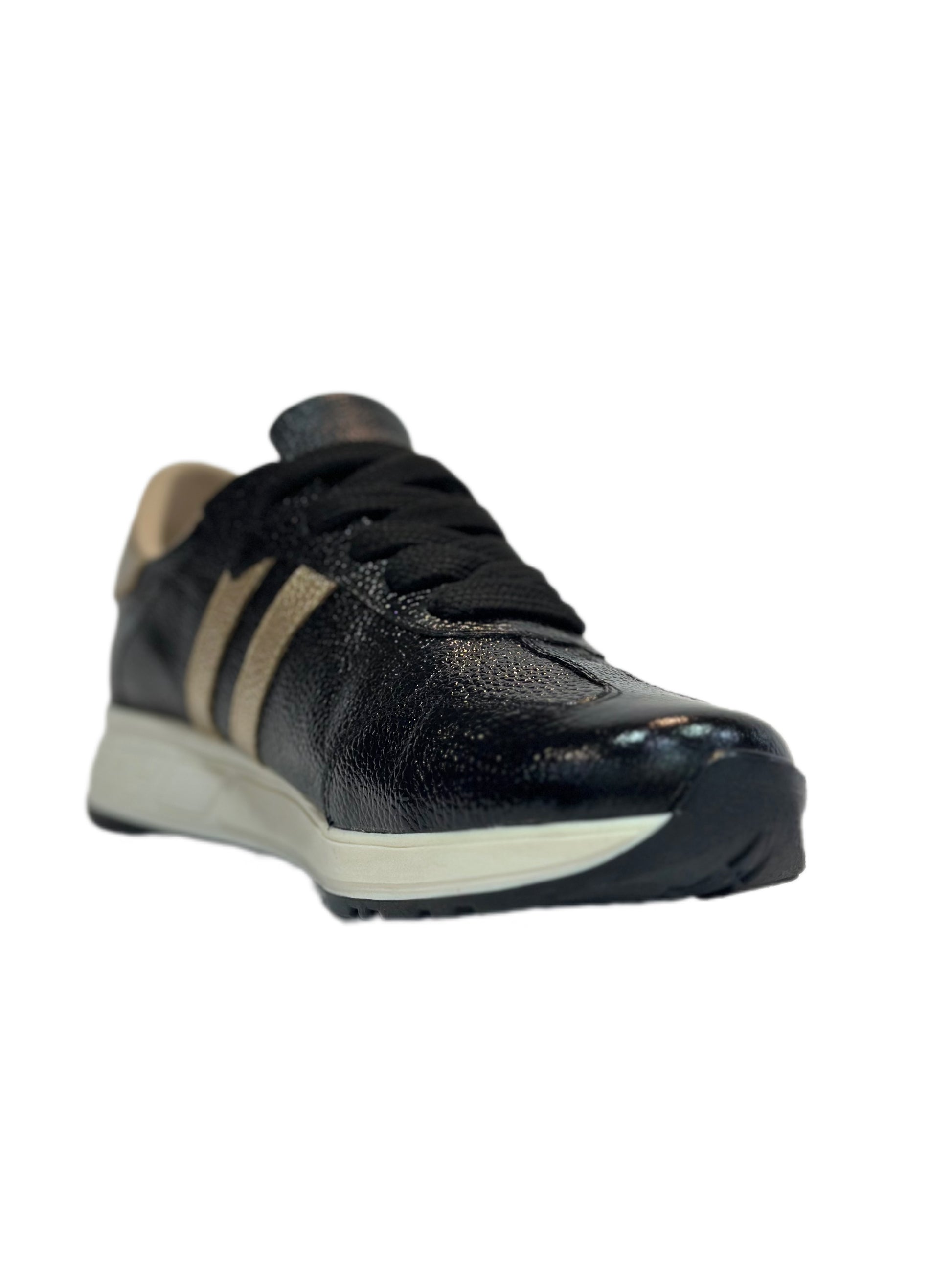 Zapatilla en cuero Clara combinación con cueros metalizados y cordones simplemente un esencial para esta temporada.