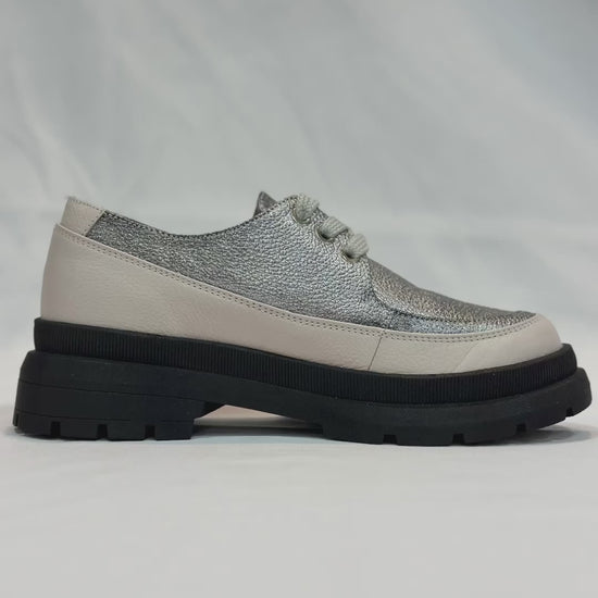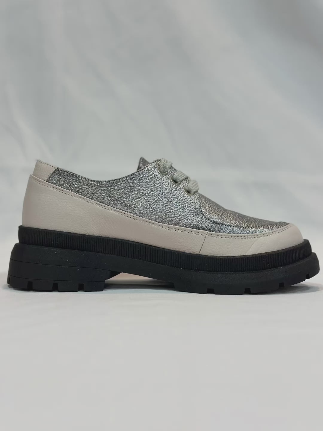 Zapato Millet tiza y silver estilo mocasín de fabricación colombiana. Estilo Urbano y Confort. Realza tu look diario con este modelo Su diseño combina diferentes tonos de silver y blanco, destacando su estilo único . La suela de plataforma negro ofrece un confort duradero y un estilo actual. Ideales para quienes buscan un calzado con detalles únicos y sofisticados. Ajuste mediante cordones a tono. Plataforma de 5 cm de alto